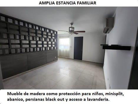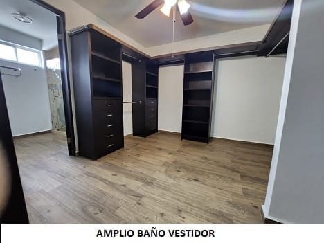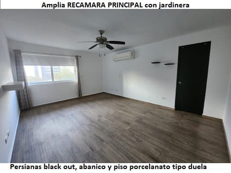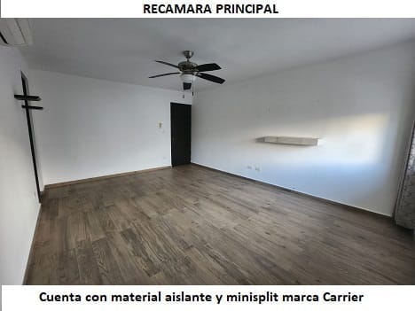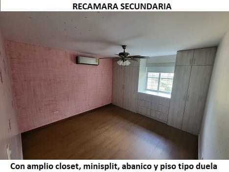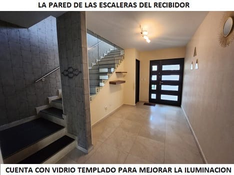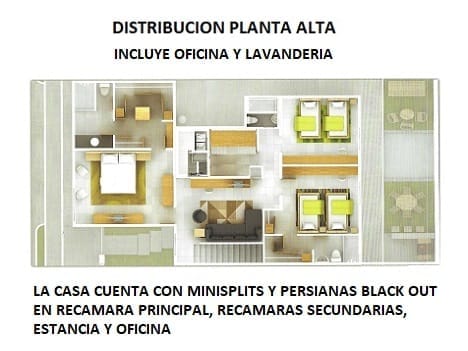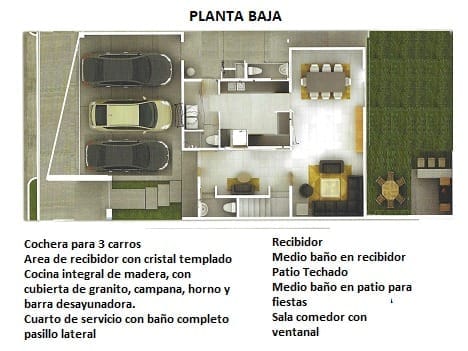 Planta Baja: cochera para 3 autos, recibidor con cristal templado, cocina integral de madera con cubierta de granito con barra desayunadora, medio baño, área de sala-comedor con ventanal, amplio patio techado con medio baño, cuarto de servicio y pasillo lateral techado. Planta Alta: 3 recamaras cada una con baño completo la principal con vestidor, amplia estancia, oficina, lavandería. Incluye: portón automático, mini splits, abanicos, persianas, boiler, lavadora, secadora, roperias en las recamaras y tina de baño.